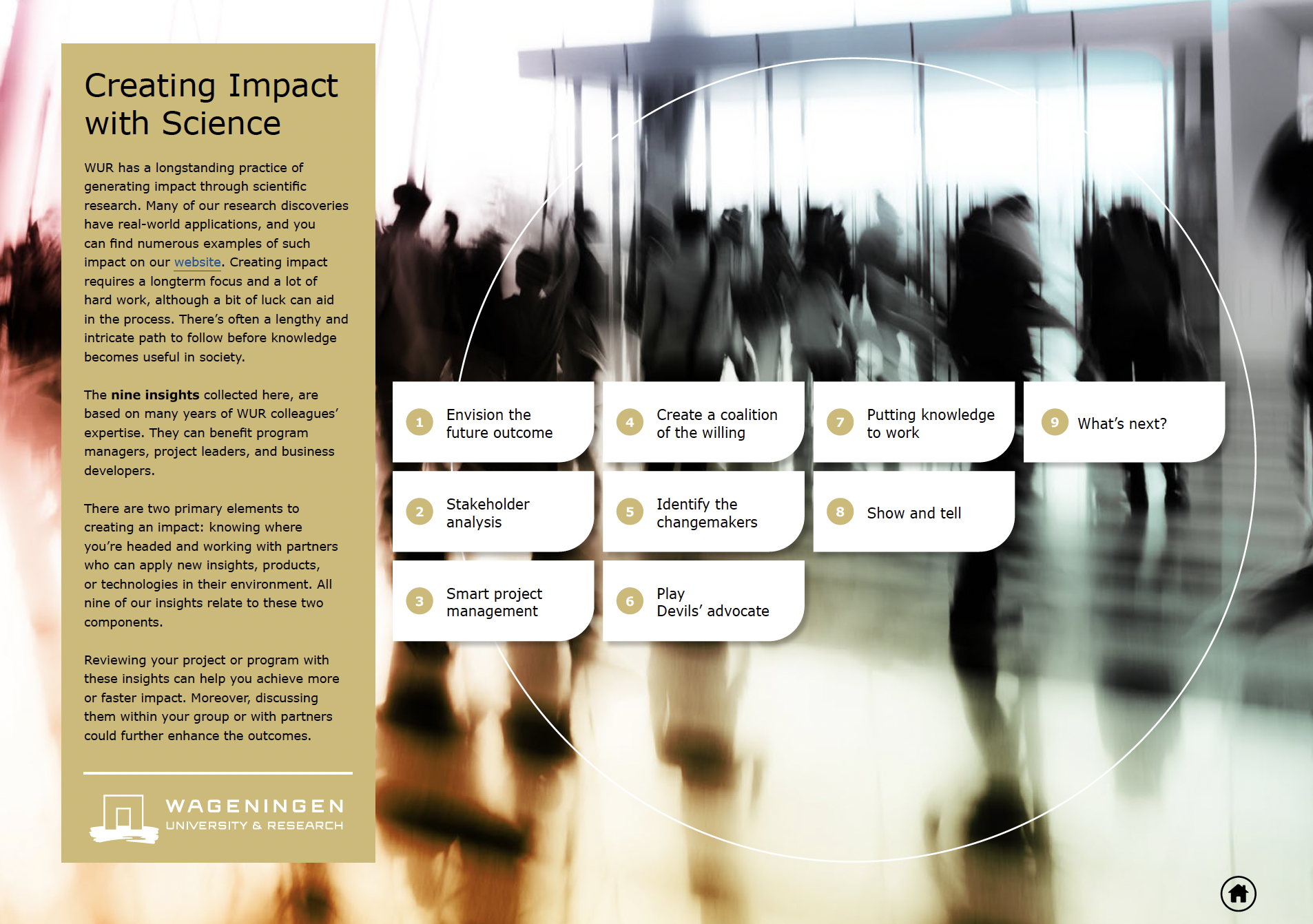 We designed a visual summary of nine key insights on how scientific research can create real-world impact. Based on years of experience at Wageningen University & Research, the series supports program managers, project leads, and partners in navigating the often complex journey from knowledge to application.